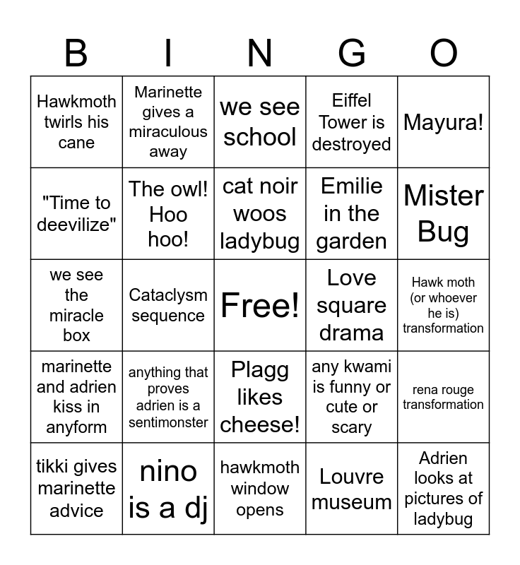 This bingo card has a free space and 67 words: Eiffel Tower, Ladybug transformation, cat noir transformation, rena rouge transformation, queen bee transformation, Chloe akumatized, Marinette gives a miraculous away, Marinette freaks about adrien, cat noir woos ladybug, Marinette visits Master Fu, Plagg likes cheese!, Gabriel is a bad dad, Hawk moth (or whoever he is) transformation, Mayura!, hawk moth says " and evilize them/him/her!", "Time to deevilize", Cataclysm sequence, Hawkmoth twirls his cane, Chloe is ridiculous, utterly ridiculous, Emilie in the garden, anything that proves adrien is a sentimonster, marinette and adrien kiss in anyform, Eiffel Tower is destroyed, Louvre museum, another free space!, Marinette trys to woo adrien, Marinette fails her plan to woo tell adrien how she feels, Lucky Charm!, Mister Bug, Ladynoir (the character), Adrien looks at pictures of ladybug, Adrien is sad, Marinette is stressed, Alya does her ladyblog, We see another hero besides ladybug and cat noir, tikki gives marinette advice, we see kwamis besides tikki and plagg, any kwami is funny or cute or scary, we see the miracle box, chloe has bad parents, the mayor is a bad mayor, The owl! Hoo hoo!, Love square drama, OMG I WANT THE IDENTITY REVEAL, Space dumpsters!, marinette designs something, adrien models, nino is a dj, marinette is clumsy, there are bad lies to hid identities, we see school, rose and julika are <3, luka is rhythm of the waves, marc and nathaniel <3, nino and alya are <3, hawkmoth window opens, hawkmoth window closes, "what am i supposed to do with this", lila is a liar!, power up, "dont be bemused, its just the news!", ladynoir moments, adrinette moments, marichat moments, ladrien moments, "Miraculous ladybug!" and "bye bye little butterfly".