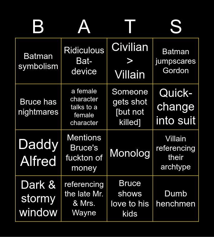 This bingo card has 16 words: referencing the late Mr. & Mrs. Wayne, Villain referencing their archtype, Civilian > Villain, Batman symbolism, Daddy Alfred, Ridiculous Bat-device, Monolog, Bruce shows love to his kids, Bruce has nightmares, a female character talks to a female character, Dark & stormy window, Batman jumpscares Gordon, Mentions Bruce's fuckton of money, Quick-change into suit, Someone gets shot [but not killed] and Dumb henchmen.