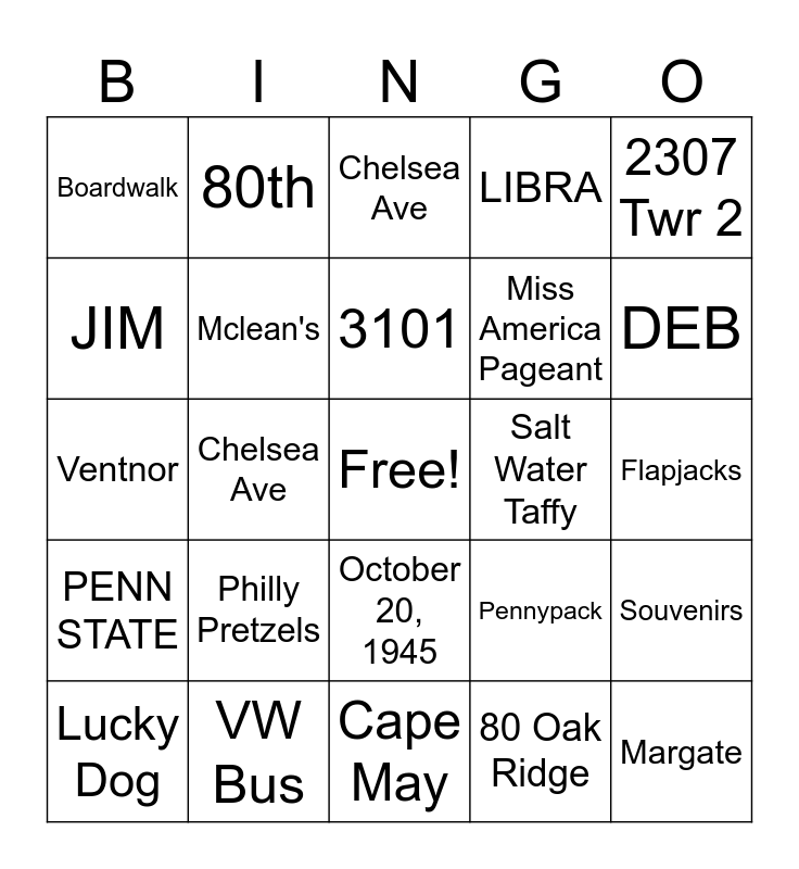 This bingo card has a free space and 29 words: Mr. Checkout, VW Bus, Chelsea Ave, Ocean Club, 2307 Twr 2, Boardwalk, Mclean's, 3101, Salt Water Taffy, Souvenirs, Lucky Dog, Chelsea Ave, 80 Oak Ridge, Margate, Ventnor, Ocean City, Cape May, Pennypack, DEB, PENN STATE, Philly Pretzels, Mr. Atlantic City, Miss America Pageant, Flapjacks, JIM, 80th, October 20, 1945, LIBRA and Mr. Checkout.