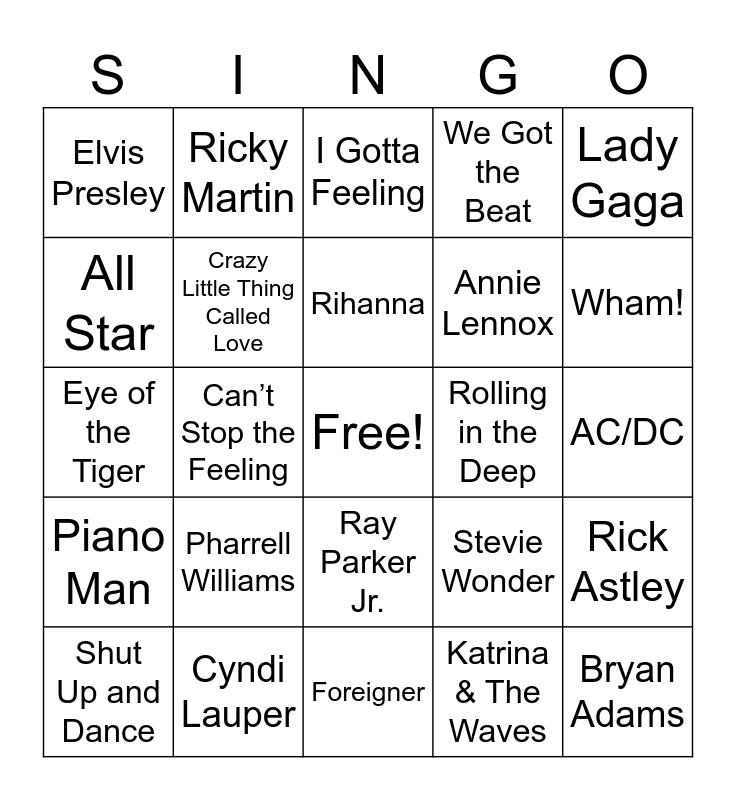 This bingo card has a free space and 28 words: Rick Astley, Take Me Home Tonight, Annie Lennox, Katrina & The Waves, All Star, I Gotta Feeling, Ricky Martin, Piano Man, Rolling in the Deep, Shut Up and Dance, Eye of the Tiger, We Got the Beat, Cyndi Lauper, Foreigner, Wham!, Crazy in Love, Pharrell Williams, Crazy Little Thing Called Love, Rihanna, Ray Parker Jr., Elvis Presley, Somebody’s Watching Me, Bryan Adams, Can’t Stop the Feeling, AC/DC, Stevie Wonder, Lady Gaga and The Ramones.