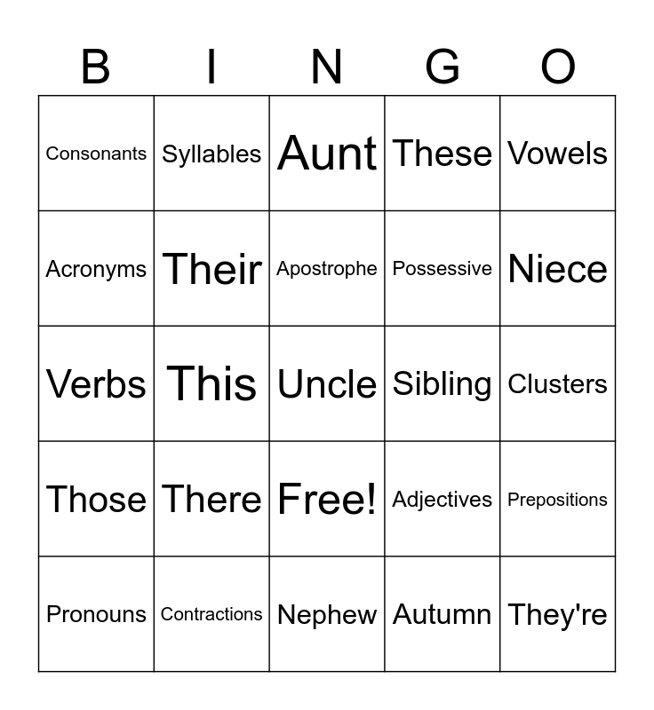 This bingo card has 26 words: Free!, Autumn, Apostrophe, Contractions, Vowels, Consonants, Acronyms, Syllables, Clusters, Adjectives, Possessive, Verbs, Prepositions, Pronouns, This, That, These, Those, Aunt, Uncle, Niece, Nephew, Sibling, There, Their and They're.