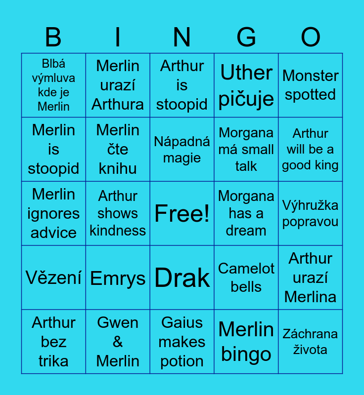This bingo card has a free space and 32 words: Merlin bingo, Gaius’s soup, Arthur shows kindness, Bromance, Vězení, Merlin čte knihu, Monster spotted, Arthur urazí Merlina, Merlin urazí Arthura, Pokus o vraždu, Nápadná magie, Arthur is stoopid, Visitors cause trouble, Lhaní královi, Morgana has a dream, Eyebrow action, Arthur bez trika, Merlin ignores advice, Drak, Emrys, Camelot bells, Destiny, Výhružka popravou, Gwen & Merlin, Záchrana života, Uther pičuje, Morgana má small talk, Merlin is stoopid, Blbá výmluva kde je Merlin, Gaius makes potion, Uther and Arthur will be a good king.