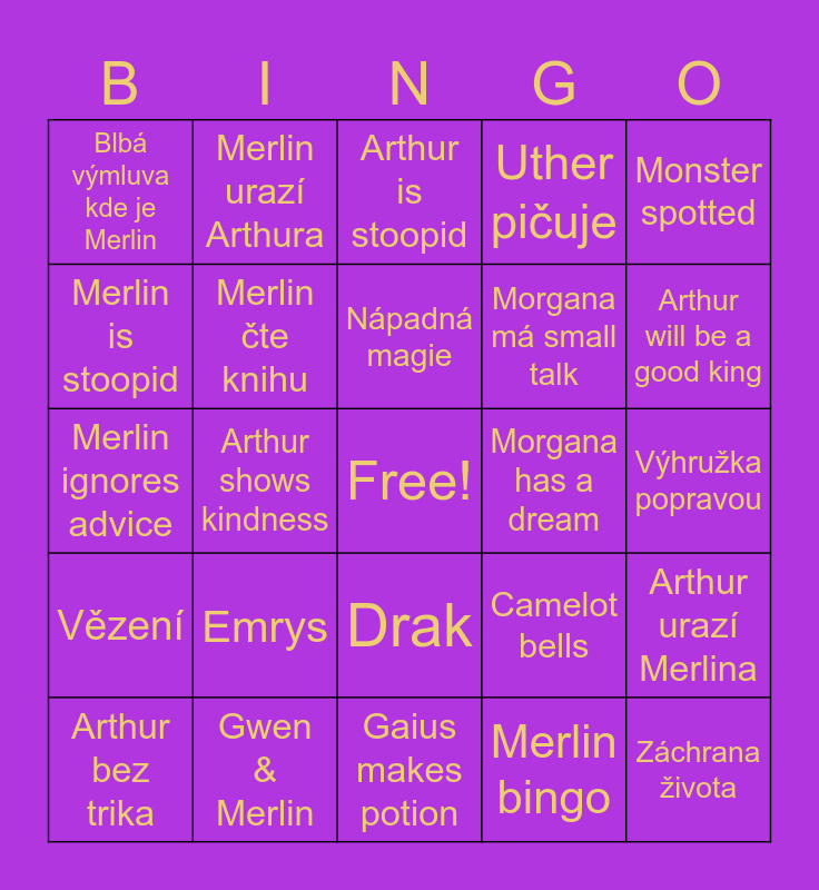 This bingo card has a free space and 32 words: Merlin bingo, Gaius’s soup, Arthur shows kindness, Bromance, Vězení, Merlin čte knihu, Monster spotted, Arthur urazí Merlina, Merlin urazí Arthura, Pokus o vraždu, Nápadná magie, Arthur is stoopid, Visitors cause trouble, Lhaní královi, Morgana has a dream, Eyebrow action, Arthur bez trika, Merlin ignores advice, Drak, Emrys, Camelot bells, Destiny, Výhružka popravou, Gwen & Merlin, Záchrana života, Uther pičuje, Morgana má small talk, Merlin is stoopid, Blbá výmluva kde je Merlin, Gaius makes potion, Uther and Arthur will be a good king.