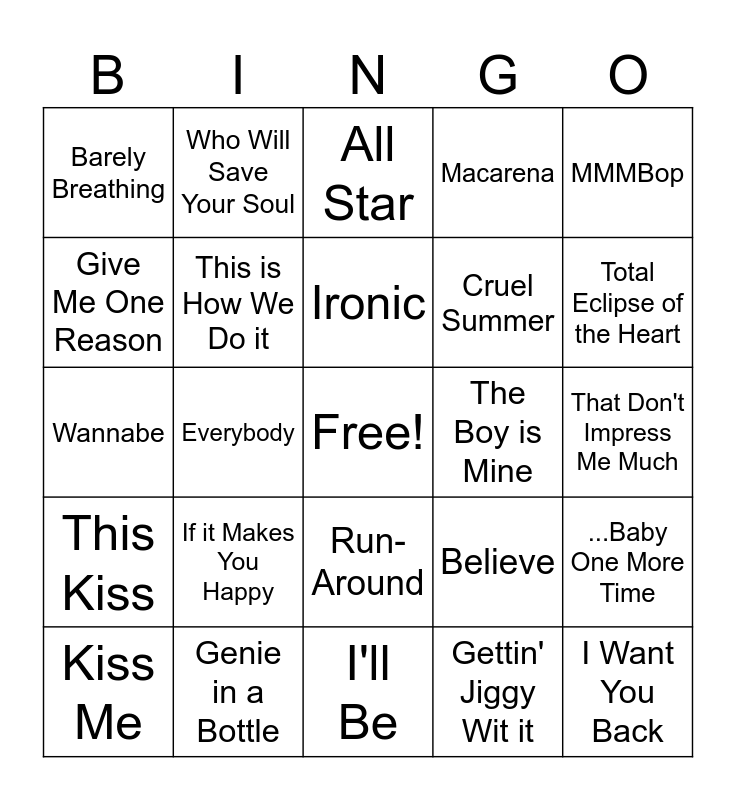 This bingo card has a free space and 35 words: Waterfalls, Kiss From a Rose, Fantasy, This is How We Do it, Run-Around, Macarena, Give Me One Reason, C'Mon N'Ride It, Ironic, Follow You Down, Wannabe, MMMBop, You Make Me Wanna..., Semi-Charmed Life, Barely Breathing, The Boy is Mine, Gettin' Jiggy Wit it, Everybody, This Kiss, I Want You Back, Believe, Kiss Me, ...Baby One More Time, Genie in a Bottle, All Star, Total Eclipse of the Heart, I Love You Always Forever, The Freshman, Cruel Summer, That Don't Impress Me Much, Mambo No. 5, I'll Be, If it Makes You Happy, Who Will Save Your Soul and Only Wanna Be With You.