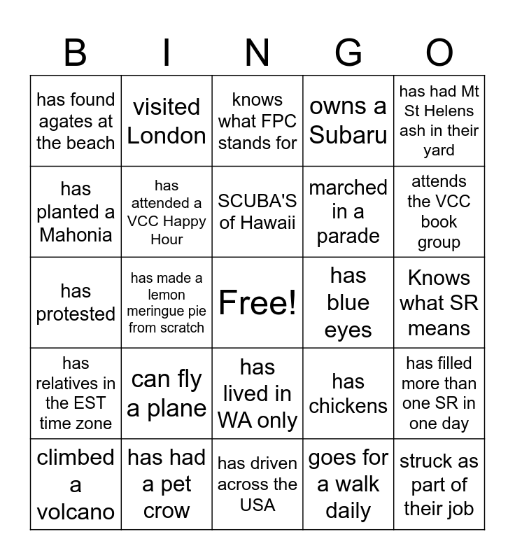 This bingo card has a free space and 24 words: can fly a plane, has had a pet crow, SCUBA'S of Hawaii, climbed a volcano, has had Mt St Helens ash in their yard, has found agates at the beach, has planted a Mahonia, visited London, has blue eyes, has lived in WA only, marched in a parade, has protested, has chickens, has filled more than one SR in one day, has attended a VCC Happy Hour, goes for a walk daily, Knows what SR means, knows what FPC stands for, attends the VCC book group, has made a lemon meringue pie from scratch, struck as part of their job, has relatives in the EST time zone, owns a Subaru and has driven across the USA.