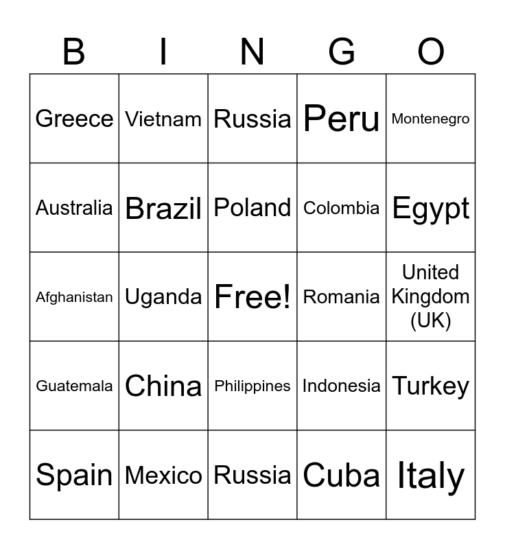 This bingo card has a free space and 58 words: Canada, Mexico, United States, Guatemala, Cuba, Argentina, Brazil, Chile, Colombia, Ecuador, Peru, Venezuela, Bosnia, France, Germany, Greece, Italy, Montenegro, Netherlands, Poland, Romania, Russia, Spain, Turkey, Ukraine, United Kingdom (UK), Algeria, Democratic Republic of the Congo, Egypt, Ethiopia, Ghana, Kenya, Morocco, Nigeria, South Africa, Sudan, Tanzania, Uganda, Afghanistan, Bangladesh, China, India, Indonesia, Iran, Japan, Myanmar, Pakistan, Philippines, Russia, South Korea, Syria, Thailand, Turkey, Uzbekistan, Vietnam, Yemen, Australia and New Zealand.