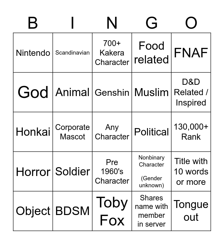 This bingo card has a free space and 24 words: Object, Soldier, Genshin, Shares name with member in server, FNAF, Nintendo, Scandinavian, 700+ Kakera Character, Political, 130,000+ Rank, Honkai, Animal, Nonbinary Character (Gender unknown), Title with 10 words or more, God, BDSM, Toby Fox, Food related, D&D Related / Inspired, Horror, Corporate Mascot, Pre 1960's Character, Muslim and Tongue out.