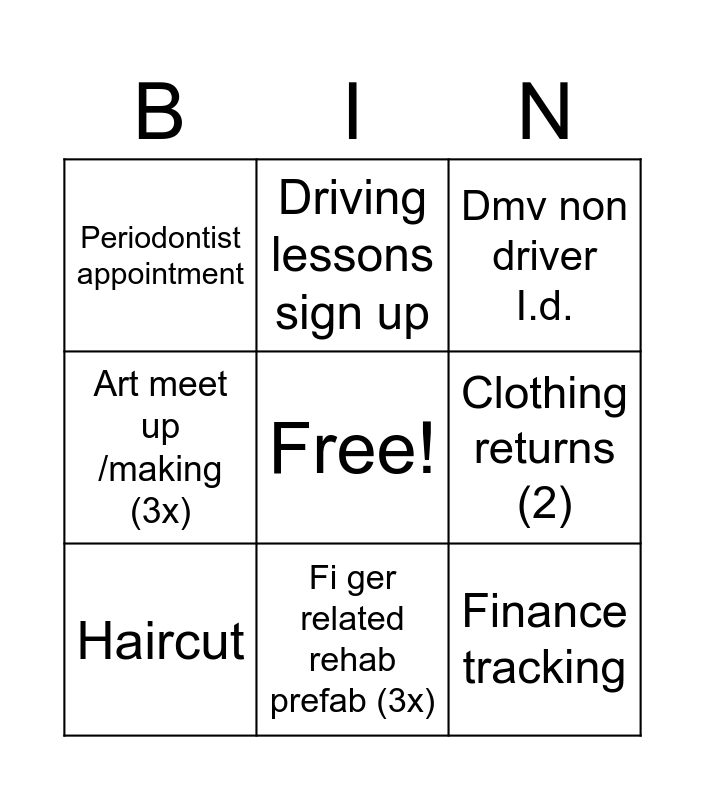 This bingo card has a free space and 8 words: Clothing returns (2), Dmv non driver I.d., Driving lessons sign up, Haircut, Periodontist appointment, Finance tracking, Art meet up /making (3x) and Fi ger related rehab prefab (3x).