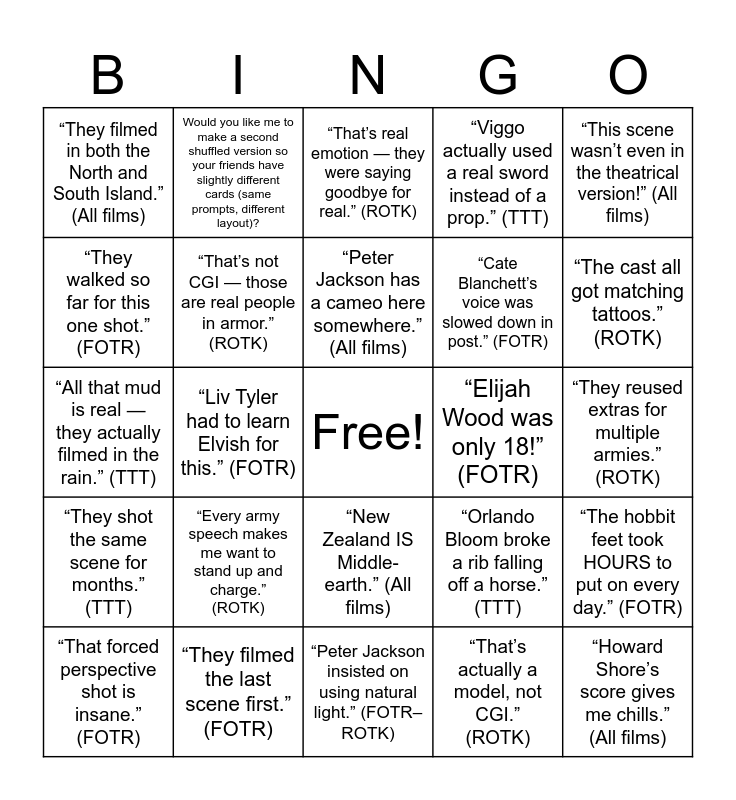 This bingo card has a free space and 35 words: Did You Know?” Edition — with movie references), “When Aragorn kicked the helmet, he actually broke his toe.” (TTT), “They filmed all three movies at once!” (FOTR–ROTK), “That’s not CGI — those are real people in armor.” (ROTK), “New Zealand IS Middle-earth.” (All films), “Viggo actually used a real sword instead of a prop.” (TTT), “They walked so far for this one shot.” (FOTR), “Sean Bean was scared of helicopters so he hiked in full costume.” (FOTR), “Peter Jackson has a cameo here somewhere.” (All films), “Those miniatures are called bigatures.” (FOTR–ROTK), “All that mud is real — they actually filmed in the rain.” (TTT), “This scene wasn’t even in the theatrical version!” (All films), “Andy Serkis did the motion capture and the voice for Gollum.” (TTT), FREE SPACE: “Extended Edition is the only edition.”, “They filmed in both the North and South Island.” (All films), “Elijah Wood was only 18!” (FOTR), “That’s actually a model, not CGI.” (ROTK), “Liv Tyler had to learn Elvish for this.” (FOTR), “They shot the same scene for months.” (TTT), “Howard Shore’s score gives me chills.” (All films), “Orlando Bloom broke a rib falling off a horse.” (TTT), “That forced perspective shot is insane.” (FOTR), “The hobbit feet took HOURS to put on every day.” (FOTR), “They filmed the last scene first.” (FOTR), “That’s real emotion — they were saying goodbye for real.” (ROTK), “The cast all got matching tattoos.” (ROTK), 🧝 Bonus Prompts (for variety or larger boards), “Sean Astin really cut his foot in this shot.” (FOTR), “Cate Blanchett’s voice was slowed down in post.” (FOTR), “They reused extras for multiple armies.” (ROTK), “The horse’s name is Brego — Viggo bought him after filming.” (TTT), “Peter Jackson insisted on using natural light.” (FOTR–ROTK), “Every army speech makes me want to stand up and charge.” (ROTK), Would you like me to make a second shuffled version so your friends have slightly different cards (same prompts, different layout)? and I can generate 2–4 unique variants so you can all play together..