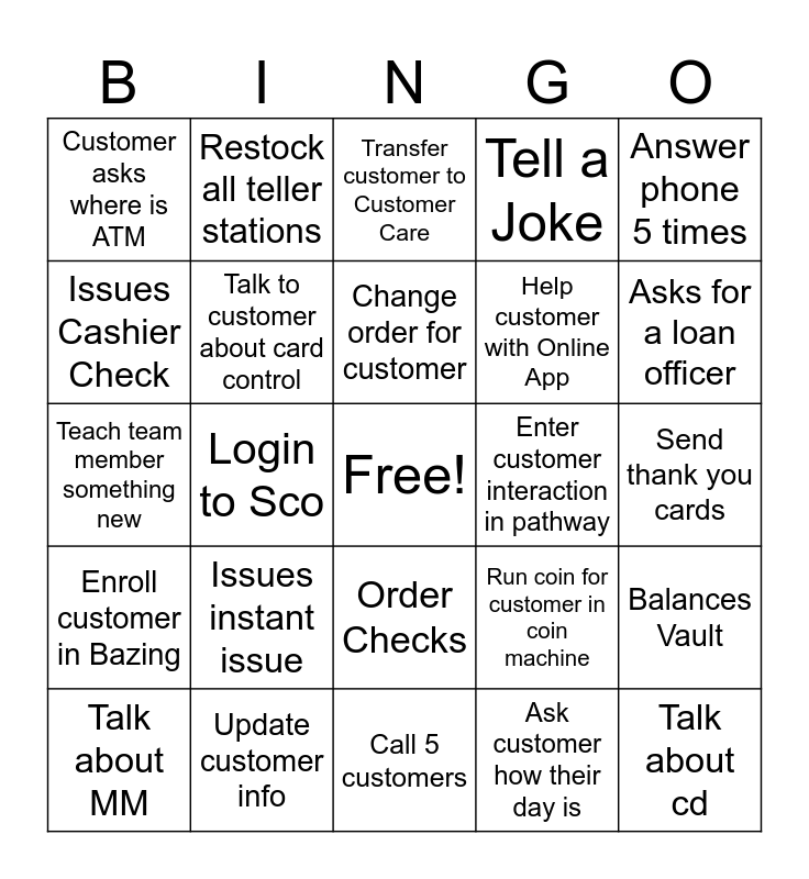 This bingo card has a free space and 24 words: Talk about MM, Issues instant issue, Change order for customer, Ask customer how their day is, Answer phone 5 times, Customer asks where is ATM, Restock all teller stations, Transfer customer to Customer Care, Enter customer interaction in pathway, Send thank you cards, Teach team member something new, Talk to customer about card control, Run coin for customer in coin machine, Balances Vault, Issues Cashier Check, Update customer info, Call 5 customers, Tell a Joke, Asks for a loan officer, Enroll customer in Bazing, Login to Sco, Order Checks, Help customer with Online App and Talk about cd.