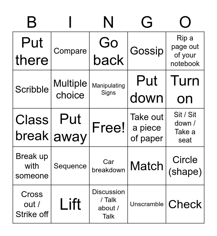 This bingo card has a free space and 53 words: School-Related Actions, Check, Label, Unscramble, Sequence, True or False, Compare, Color / Shade in, Scribble, Fill in the blank, Multiple choice, Circle (draw a circle), Circle (shape), Match, Underline, Cross out / Strike off, Manipulating Signs, Take out a piece of paper, Take out your textbook, Rip a page out of your notebook, Put away, Put back, Put down, Put there, Put under, Lift, Carry, Give, Enter, Turn on, Walk, Run / Running, Break, Buy, Eat, Drink, Gossip, Discussion / Talk about / Talk, Go back, Throw away, Leave, Turn off, Sit / Sit down / Take a seat, Snapshot Signs, Break, Car breakdown, Broke (money), Spring break, Class break, Break up with someone, Chair and sit, Example and show and Scissors and cut.