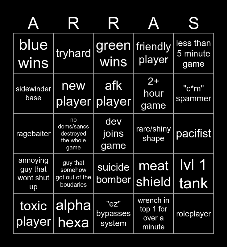 This bingo card has a free space and 24 words: guy that somehow got out of the boudaries, alpha hexa, afk player, toxic player, less than 5 minute game, blue wins, sidewinder base, tryhard, rare/shiny shape, suicide bomber, 2+ hour game, ragebaiter, meat shield, lvl 1 tank, new player, wrench in top 1 for over a minute, pacifist, green wins, "c*m" spammer, no doms/sancs destroyed the whole game, roleplayer, annoying guy that wont shut up, friendly player and "ez" bypasses system.