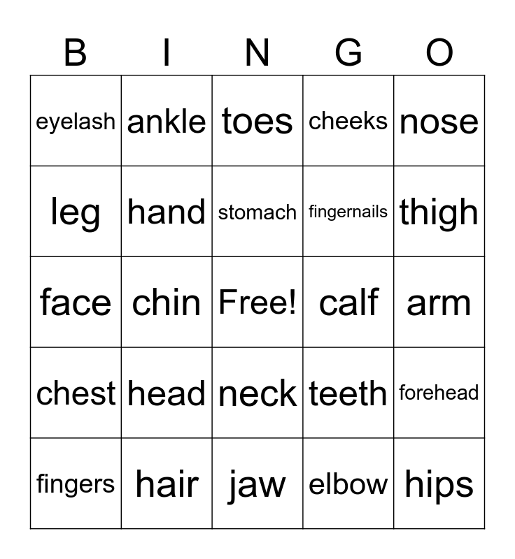 This bingo card has a free space and 37 words: eye, lips, mouth, hand, forehead, head, stomach, eyebrow, nose, ears, chin, cheeks, hips, arm, leg, chest, shoulder, toes, neck, calf, eyelash, thigh, fingers, jaw, knee, elbow, ankle, wrist, forearm, knuckles, throat, hair, face, palm, teeth, fingernails and toenails.