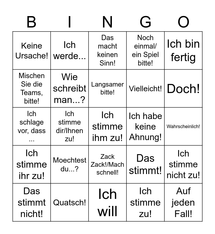 This bingo card has 35 words: Entschuldigung, Ich muss kurz weg., Wie sagt man ...?, Wie schreibt man...?, Zack Zack!/Mach schnell!, Noch einmal/ ein Spiel bitte!, Mischen Sie die Teams, bitte!, Wie bitte!, Langsamer bitte!, Wiederholen Sie bitte!, Ich schlage vor, dass ..., Ich bin fertig, fast, noch nicht, Keine Ursache!, Ich habe keine Ahnung!, Ich stimme zu!, Ich stimme dir/Ihnen zu!, Ich stimme ihr zu!, Ich stimme ihm zu!, Das stimmt!, Das stimmt nicht!, Ich stimme nicht zu!, Quatsch!, Das macht keinen Sinn!, Doch!, Auf jeden Fall!, Auf keinen Fall!, Vielleicht!, Wahrscheinlich!, Ich brauche, Ich will, Moechtest du...?, Ich werde... and Darf ich/ Kann ich...?.