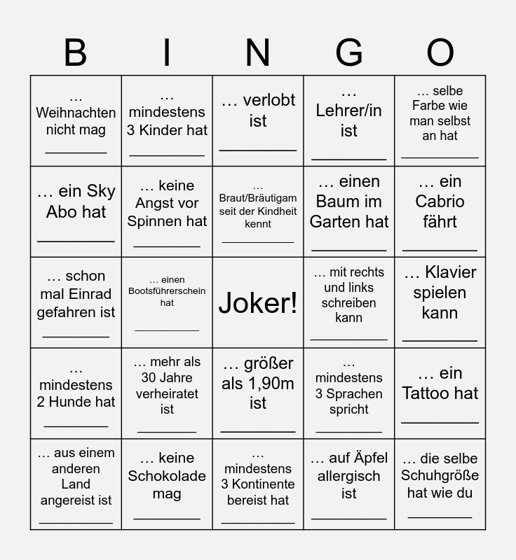 This bingo card has a free space and 24 words: … mehr als 30 Jahre verheiratet ist ________, … keine Schokolade mag ________, …Braut/Bräutigam seit der Kindheit kennt ____________, … aus einem anderen Land angereist ist __________, … selbe Farbe wie man selbst an hat ___________, … Weihnachten nicht mag ________, … ein Sky Abo hat ________, … mindestens 3 Kinder hat _________, … mit rechts und links schreiben kann ___________, … größer als 1,90m ist ________, … einen Baum im Garten hat ________, … schon mal Einrad gefahren ist ________, … mindestens 3 Sprachen spricht _________, … ein Tattoo hat ________, … keine Angst vor Spinnen hat ________, … auf Äpfel allergisch ist _________, … Klavier spielen kann ________, … verlobt ist ________, … ein Cabrio fährt ________, … einen Bootsführerschein hat ____________, … die selbe Schuhgröße hat wie du ________, … mindestens 2 Hunde hat ________, … Lehrer/in ist ________ and … mindestens 3 Kontinente bereist hat __________.