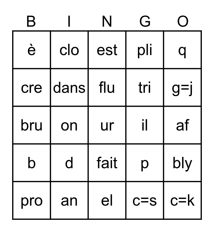 This bingo card has 30 words: an, un, on, ai=è, è, est, dans, fait, il, el, af, ur, c=s, c=k, g=j, g=gu, p, b, d, q, bru, gla, clo, tri, cre, pli, bly, pro, flu and dra.