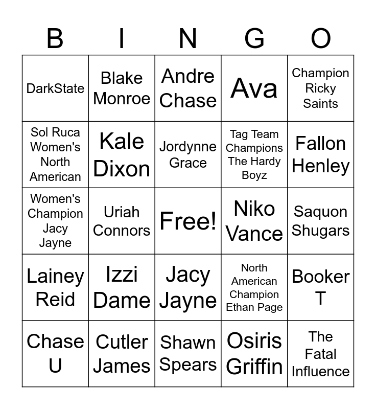 This bingo card has a free space and 29 words: Chase U, The Culling, Uriah Connors, Tatum Paxley, DarkState, Andre Chase, Kale Dixon, Izzi Dame, Niko Vance, Cutler James, Saquon Shugars, The Fatal Influence, Shawn Spears, Osiris Griffin, Fallon Henley, Dion Lennox, Jacy Jayne, Lainey Reid, Champion Ricky Saints, Women's Champion Jacy Jayne, North American Champion Ethan Page, El Grande Americano, Tag Team Champions The Hardy Boyz, Sol Ruca Women's North American, Ava, Blake Monroe, Booker T, Jordynne Grace and Josh Briggs.
