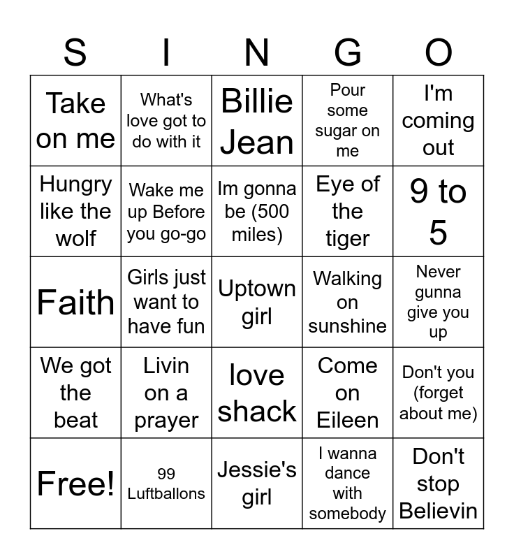 This bingo card has a free space and 29 words: Free!, Africa, Girls just want to have fun, Karma Chameleon, Take on me, Billie Jean, Wake me up Before you go-go, Livin on a prayer, Walking on sunshine, 99 Luftballons, Never gunna give you up, Don't stop Believin, Jessie's girl, I wanna dance with somebody, 9 to 5, Under pressure, love shack, We got the beat, I'm coming out, Faith, Come on Eileen, The safety dance, Eye of the tiger, Hungry like the wolf, Pour some sugar on me, What's love got to do with it, Don't you (forget about me), Im gonna be (500 miles) and Celebration.