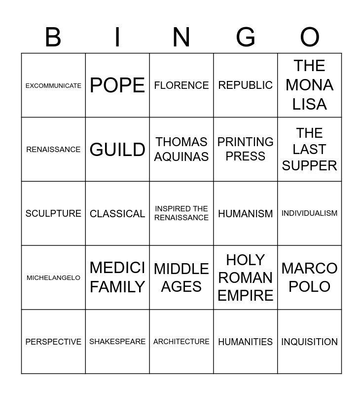 This bingo card has 31 words: ARCHITECTURE, CITY-STATE, CLASSICAL, CLERGY, EXCOMMUNICATE, FLORENCE, GUILD, HOLY ROMAN EMPIRE, HUMANISM, HUMANITIES, INDIVIDUALISM, INSPIRED THE RENAISSANCE, INQUISITION, ITALIAN PENINSULA, THE LAST SUPPER, LEONARDO, MARCO POLO, MEDICI FAMILY, MICHELANGELO, MIDDLE AGES, THE MONA LISA, PATRON, PERSPECTIVE, POPE, PRINTING PRESS, RENAISSANCE, REPUBLIC, SCULPTURE, SHAKESPEARE, THOMAS AQUINAS and VENICE.