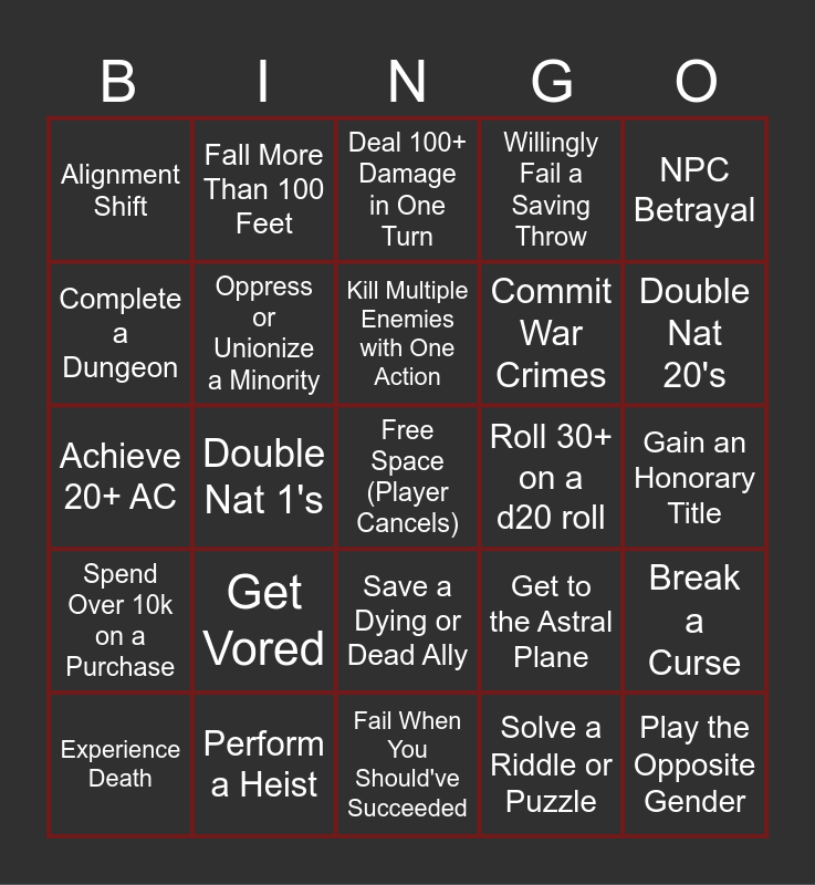 This bingo card has a free space and 29 words: Experience Death, Slay a Dragon, Double Nat 1's, Play a Furry or Scalie, Alignment Shift, Deal 100+ Damage in One Turn, Oppress or Unionize a Minority, Get Vored, Roll 30+ on a d20 roll, Perform a Heist, Gain an Honorary Title, Play the Opposite Gender, Fail When You Should've Succeeded, Solve a Riddle or Puzzle, Double Nat 20's, Adopt a Wild Animal, Save a Dying or Dead Ally, Spend Over 10k on a Purchase, NPC Betrayal, Achieve 20+ AC, Get to the Astral Plane, Succeed When You Should've Failed, Commit War Crimes, Complete a Dungeon, Willingly Fail a Saving Throw, Fall More Than 100 Feet, Break a Curse, Kill Multiple Enemies with One Action and Waheed Takes a 10+ Minute Random Errand.