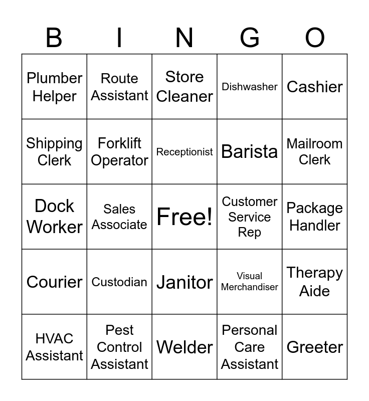 This bingo card has a free space and 56 words: Automotive Technician, HVAC Assistant, Electrician Apprentice, Plumber Helper, Welder, Construction Laborer, Forklift Operator, Maintenance Technician, Barista, Line Cook, Dishwasher, Host/Hostess, Hotel Housekeeper, Catering Assistant, Fast Food Crew Member, Banquet Server, Cashier, Sales Associate, Stock Clerk, Greeter, Customer Service Rep, Inventory Assistant, Visual Merchandiser, Store Cleaner, Data Entry Clerk, Receptionist, Office Assistant, IT Support Trainee, Mailroom Clerk, Library Aide, Records Clerk, Call Center Agent, Delivery Driver, Warehouse Associate, Package Handler, Shipping Clerk, Dock Worker, Inventory Scanner, Courier, Route Assistant, Janitor, Landscaper, Groundskeeper, Recycling Sorter, Building Maintenance Aide, Custodian, Pest Control Assistant, Window Cleaner, Dietary Aide, Home Health Aide, Personal Care Assistant, Hospital Transporter, Childcare Assistant, Activities Coordinator, Therapy Aide and Veterinary Assistant.