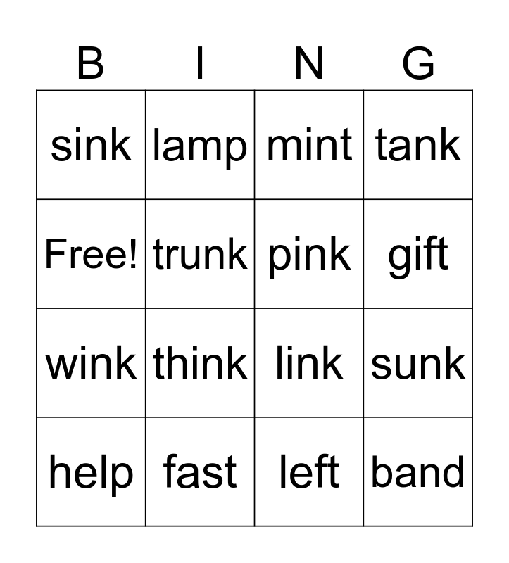 This bingo card has 16 words: fast, sunk, mint, sink, wink, lamp, link, left, Free!, trunk, help, tank, think, gift, pink and band.