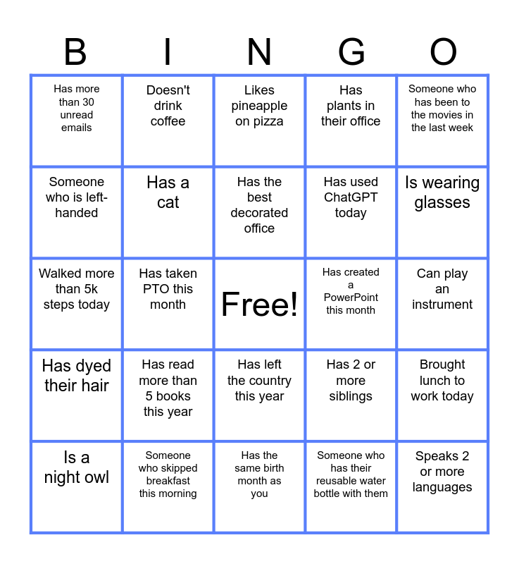 This bingo card has a free space and 46 words: Has worked at Bellevue 5+ years, Speaks 2 or more languages, Is wearing Blue today, Has the same birth month as you, Has read more than 5 books this year, Has worked at another HHC facility, Doesn't drink coffee, Has posted on LinkedIn today, Someone who is left-handed, Has a dog, Has a cat, Has plants in their office, Brought lunch to work today, Has 2 or more siblings, Someone whose favorite color is red, Has attended more than 3 meetings today, Has the best decorated office, Has created a PowerPoint this month, Has printed something today, Someone who has been to the movies in the last week, Has taken PTO this month, Someone who has their reusable water bottle with them, Has more than 30 unread emails, Has used ChatGPT today, Is wearing an apple watch, Is wearing glasses, Is a night owl, Has broken a bone, Has left the country this year, Has dyed their hair, Has a tattoo, Has gone sky diving, Drank tea today, Has worked late this week, Has sent a GIF this week, Someone who skipped breakfast this morning, Can play an instrument, Wearing hoop earrings, Has taken a group photo, Has run a race or a marathon, Someone wearing plaid, Likes pineapple on pizza, Walked more than 5k steps today, Had a coffee break today, Wearing colorful socks and Has complimented someone today.