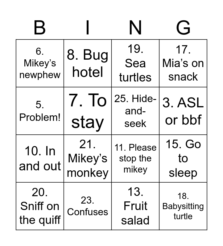 This bingo card has 26 words: 1. Where’s Mikey, 2. Hide no peep, 3. ASL or bbf, 4. Run away bear, 5. Problem!, 6. Mikey’s newphew, 7. To stay, 8. Bug hotel, 13. Fruit salad, 9. Class photo, 10. In and out, 11. Please stop the mikey, 12. Turtle tour, 14. Blast off day, 15. Go to sleep, 16. Heist, 17. Mia’s on snack, 18. Babysitting turtle, 19. Sea turtles, 20. Sniff on the quiff, 21. Mikey’s monkey, 22. Ing cookies are ready, 23. Confuses, 24. Day in the woods, 25. Hide-and-seek and 26. Bad hair day.