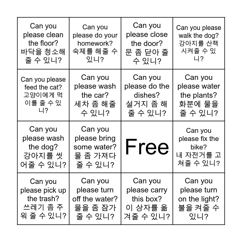 This bingo card has 16 words: Can you please turn off the water? 물을 좀 잠가줄 수 있니?, Can you please fix the bike? 내 자전거를 고쳐줄 수 있니?, Can you please close the door? 문 좀 닫아 줄 수 있니?, Can you please clean the floor? 바닥을 청소해 줄 수 있니?, Can you please wash the dog? 강아지를 씻어줄 수 있니?, Can you please do your homework? 숙제를 해줄 수 있니?, Free, Can you please carry this box? 이 상자를 옮겨줄 수 있니?, Can you please feed the cat? 고양이에게 먹이를 줄 수 있니?, Can you please wash the car? 세차 좀 해줄 수 있니?, Can you please pick up the trash? 쓰레기 좀 주워 줄 수 있니?, Can you please walk the dog? 강아지를 산책 시켜줄 수 있니?, Can you please bring some water? 물 좀 가져다 줄 수 있니?, Can you please water the plants? 화분에 물을 줄 수 있니?, Can you please do the dishes? 설거지 좀 해줄 수 있니? and Can you please turn on the light? 불을 켜줄 수 있니?.