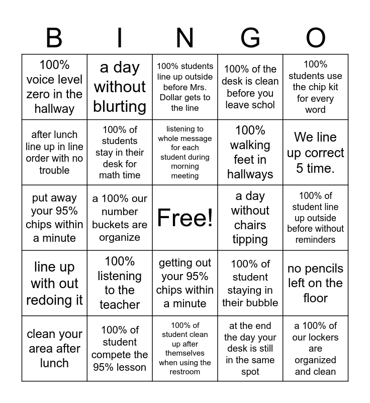 This bingo card has a free space and 24 words: 100% listening to the teacher, 100% of student compete the 95% lesson, listening to whole message for each student during morning meeting, clean your area after lunch, 100% students use the chip kit for every word, 100% voice level zero in the hallway, after lunch line up in line order with no trouble, a day without blurting, a day without chairs tipping, getting out your 95% chips within a minute, 100% walking feet in hallways, put away your 95% chips within a minute, 100% of student staying in their bubble, no pencils left on the floor, 100% of students stay in their desk for math time, at the end the day your desk is still in the same spot, 100% of student line up outside before without reminders, 100% students line up outside before Mrs. Dollar gets to the line, We line up correct 5 time., a 100% our number buckets are organize, a 100% of our lockers are organized and clean, line up with out redoing it, 100% of the desk is clean before you leave schol and 100% of student clean up after themselves when using the restroom.