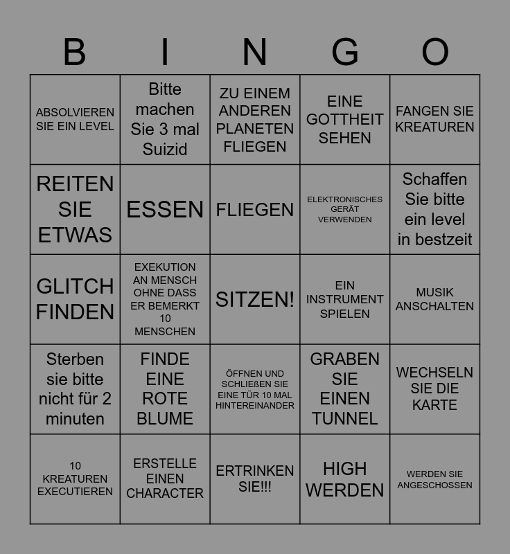 This bingo card has a free space and 24 words: FINDE EINE ROTE BLUME, ERSTELLE EINEN CHARACTER, FLIEGEN, 10 KREATUREN EXECUTIEREN, FANGEN SIE KREATUREN, ABSOLVIEREN SIE EIN LEVEL, REITEN SIE ETWAS, Bitte machen Sie 3 mal Suizid, EIN INSTRUMENT SPIELEN, ÖFFNEN UND SCHLIEßEN SIE EINE TÜR 10 MAL HINTEREINANDER, ELEKTRONISCHES GERÄT VERWENDEN, GLITCH FINDEN, GRABEN SIE EINEN TUNNEL, WECHSELN SIE DIE KARTE, ESSEN, HIGH WERDEN, MUSIK ANSCHALTEN, ZU EINEM ANDEREN PLANETEN FLIEGEN, Schaffen Sie bitte ein level in bestzeit, EXEKUTION AN MENSCH OHNE DASS ER BEMERKT 10 MENSCHEN, WERDEN SIE ANGESCHOSSEN, Sterben sie bitte nicht für 2 minuten, EINE GOTTHEIT SEHEN and ERTRINKEN SIE!!!.
