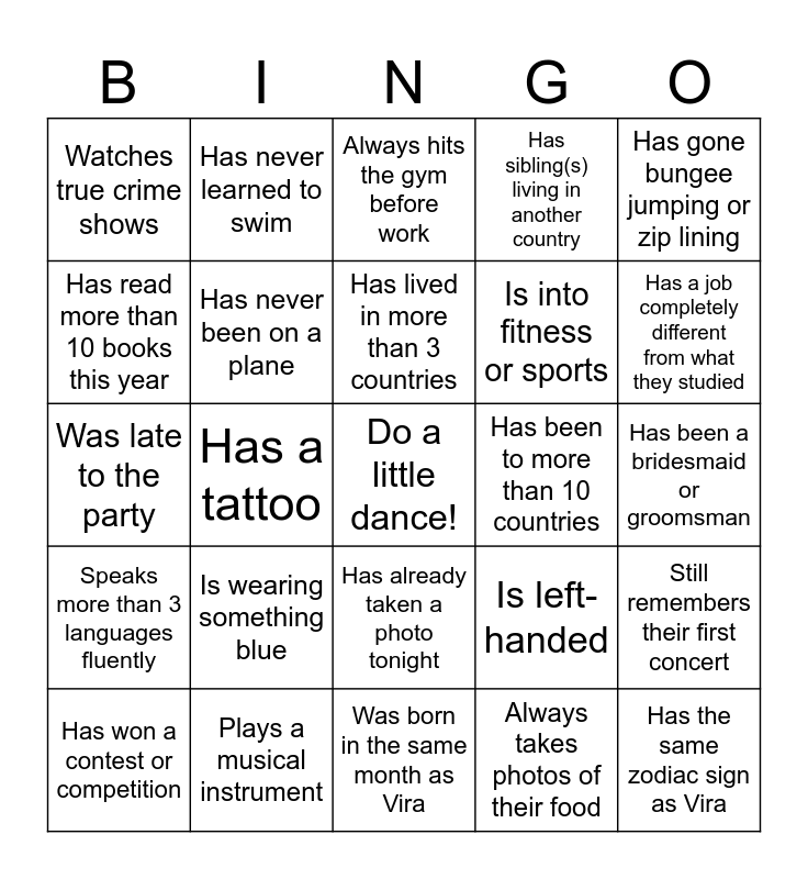 This bingo card has a free space and 33 words: Has a pet (cat), Has a pet (dog), Has a tattoo, Has never broken a bone, Speaks more than 3 languages fluently, Has never been on a plane, Has gone bungee jumping or zip lining, Has won a contest or competition, Has never learned to swim, Has met a celebrity, Has lived in more than 3 countries, Always hits the gym before work, Hates coffee, Has been to more than one wedding this year, Has been to more than 10 countries, Has a job completely different from what they studied, Plays a musical instrument, Was late to the party, Is wearing something blue, Is left-handed, Has already taken a photo tonight, Brought food with garlic in it, Watches true crime shows, Has been a bridesmaid or groomsman, Was born in the same month as Vira, Has the same zodiac sign as Vira, Has sibling(s) living in another country, Is into fitness or sports, Has read more than 10 books this year, Still remembers their first concert, Prefers salty over sweet snacks, Always takes photos of their food and Knows how to mix a good cocktail.