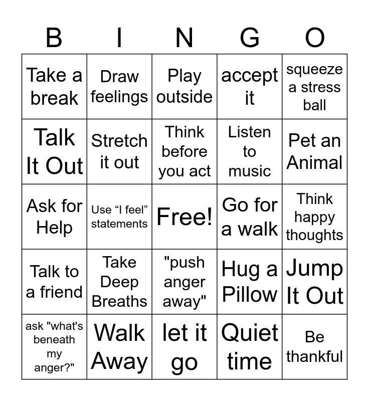 This bingo card has a free space and 24 words: Take Deep Breaths, Walk Away, Think before you act, ask "what's beneath my anger?", squeeze a stress ball, Take a break, Talk It Out, Draw feelings, Go for a walk, "push anger away", Listen to music, Ask for Help, Hug a Pillow, Jump It Out, Stretch it out, Quiet time, Think happy thoughts, Play outside, Pet an Animal, Use “I feel” statements, Be thankful, Talk to a friend, accept it and let it go.