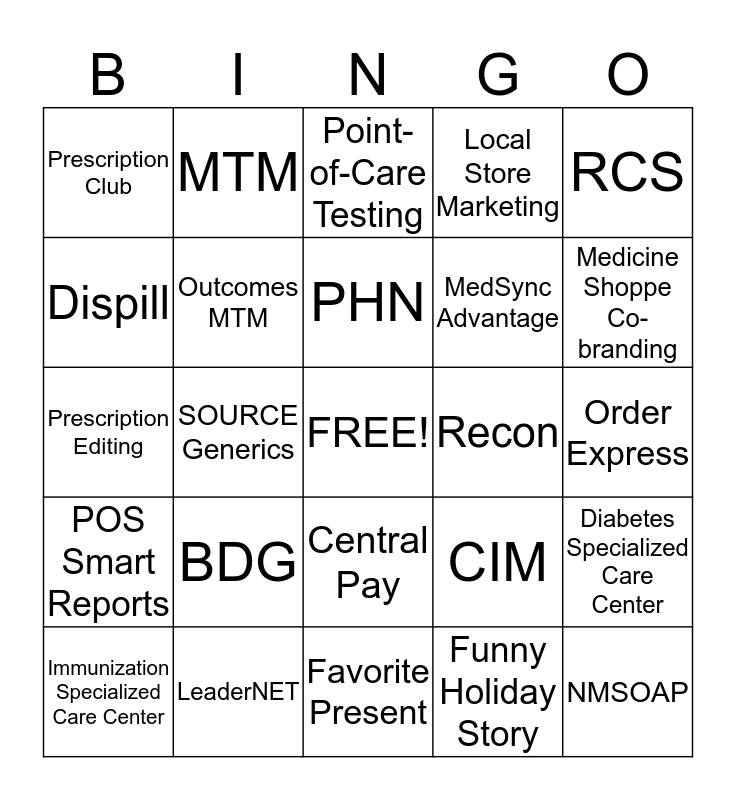 This bingo card has a free space and 24 words: BDG, LeaderNET, PHN, Immunization Specialized Care Center, RCS, Prescription Club, Dispill, MTM, Recon, Central Pay, MedSync Advantage, Prescription Editing, CIM, Diabetes Specialized Care Center, Outcomes MTM, Funny Holiday Story, Order Express, Point-of-Care Testing, Medicine Shoppe Co-branding, SOURCE Generics, NMSOAP, POS Smart Reports, Local Store Marketing and Favorite Present.