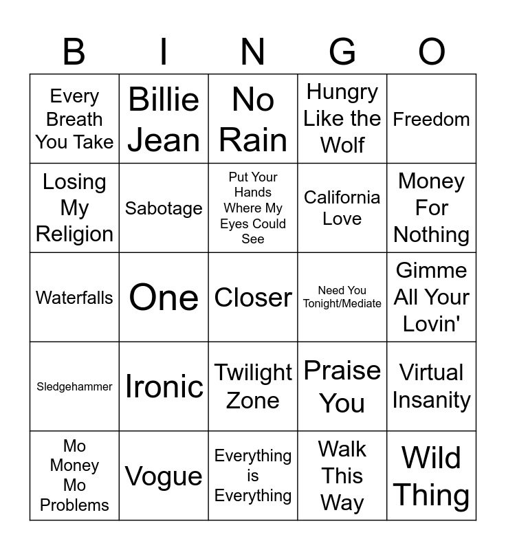 This bingo card has 60 words: Thriller, Vogue, Smells Like Teen Spirit, Sledgehammer, Walk This Way, Sweet Child O' Mine, Sabotage, Addicted to Love, California Love, Express Yourself, Hungry Like the Wolf, Beat It, Losing My Religion, Take On Me, The Rain (Supa Dupa Fly), Every Breath You Take, Closer, Freedom, Jeremy, Put Your Hands Where My Eyes Could See, Need You Tonight/Mediate, No Rain, Mo Money Mo Problems, Virtual Insanity, You Might Think, Welcome to the Jungle, Mama Said Knock You Out, Rockit, Money For Nothing, Freak on a Leash, Sweet Dreams (are made of this), Nuthin' But A G Thang, Jump, Nothing Compares 2 U, Billie Jean, Give It Away, Bittersweet Symphony, One, Girls Just Want to have Fun, Waterfalls, Wanted Dead or Alive, Ironic, Gimme All Your Lovin', Rhythm Nation, Praise You, Once in a Lifetime, Janie's Got a Gun, Straight Up, Lucky Star, Twilight Zone, Everything is Everything, Our House, Just a Gigolo, Enter Sandman, It's Oh So Quiet, My Lovin' Never Gonna Get It, Voices Carry, Right Now, Wild Thing and Gonna Make You Sweat.