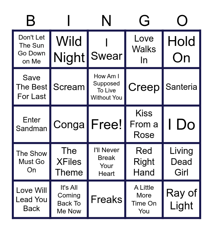 This bingo card has a free space and 24 words: The XFiles Theme, It's All Coming Back To Me Now, How Am I Supposed To Live Without You, Love Will Lead You Back, Hold On, Don't Let The Sun Go Down on Me, Save The Best For Last, Wild Night, Kiss From a Rose, I'll Never Break Your Heart, Creep, Enter Sandman, Red Right Hand, Living Dead Girl, Scream, A Little More Time On You, I Do, I Swear, Santeria, Conga, Ray of Light, The Show Must Go On, Love Walks In and Freaks.