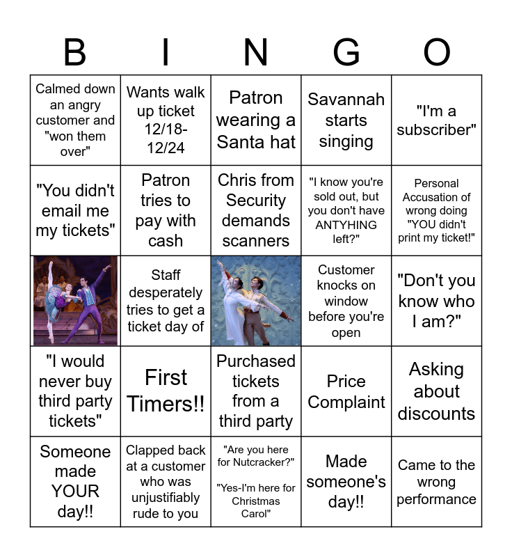 This bingo card has 3 images, a free space and 45 words: Wore their Fancy Flannel to the ballet, Came to the wrong performance, "Don't you have a Christmas Miracle" ticket beg when you said you were sold out, "Are you here for Nutcracker?" "Yes-I'm here for Christmas Carol", First Timers!!, "Your website rerouted me to a third party", Wants walk up ticket 12/18-12/24, "have to get back in line" complaint, "You didn't email me my tickets", Can't login to account online, Patron tries to pay with cash, Savannah starts singing, Asking about discounts, Price Complaint, Parking Complaint, Double Scan!, Chris from Security demands scanners, Customer knocks on window before you're open, Wearing Birkenstocks, "I'm a subscriber", Staff desperately tries to get a ticket day of, Made someone's day!!, Calmed down an angry customer and "won them over", "I know you're sold out, but you don't have ANTYHING left?", Life Story at Ticket Window, Personal Accusation of wrong doing "YOU didn't print my ticket!", Someone made YOUR day!!, Accidentally told someone you didn't have their tickets at Will Call but then found them at the end of your shift in your box, Purchased tickets from a third party, "I would never buy third party tickets", Purchased tickets from a third party and mad we are sold out and can't get them in, "I played for the symphony, I usually get free tickets" harassment roughly every 10 minutes Specific Man with a "dapper dan" cap, Patron asks if you're stupid, Street musician starts playing and drowns out your ability to hear the microphone, Clapped back at a customer who was unjustifiably rude to you, "Gil got me Tickets", "Sameed got me tickets", "Don't you know who I am?", Sameed waits in the Will Call line like a regular patron, "Can I speak to a man?", NO REPRINT NIGHT!!!, Someone brings the Box Office treats!!, Patron wearing a Santa hat, 2000+ actual attendees EVERY PERFORMANCE! and Kristina or Julia says "We don't have Rats".