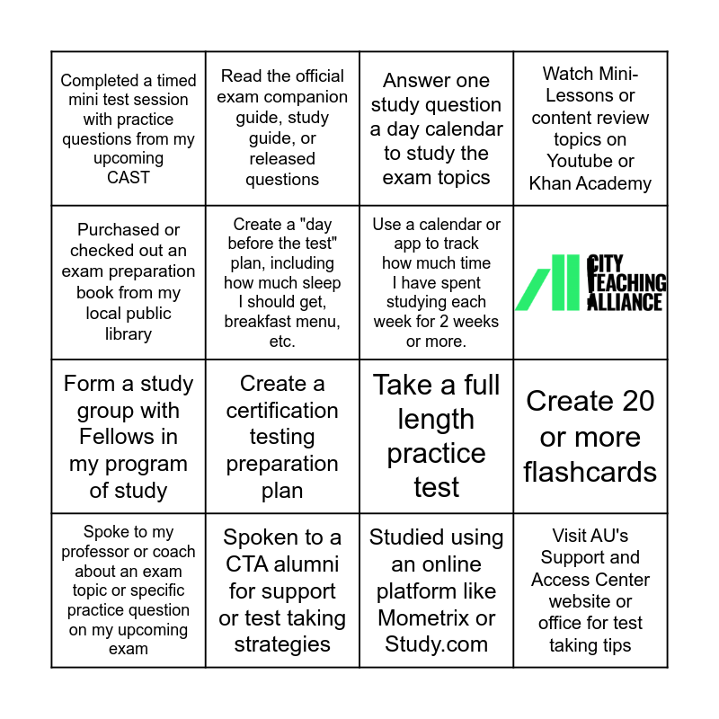 This bingo card has 1 images and 18 words: Create a certification testing preparation plan, Visit AU's Support and Access Center website or office for test taking tips, Answer one study question a day calendar to study the exam topics, Completed a timed mini test session with practice questions from my upcoming CAST, Take a full length practice test, Watch Mini-Lessons or content review topics on Youtube or Khan Academy, Spoke to my professor or coach about an exam topic or specific practice question on my upcoming exam, Read the official exam companion guide, study guide, or released questions, !, Form a study group with Fellows in my program of study, Studied using an online platform like Mometrix or Study.com, Purchased or checked out an exam preparation book from my local public library, Create 20 or more flashcards, Create a "day before the test" plan, including how much sleep I should get, breakfast menu, etc., Use a calendar or app to track how much time I have spent studying each week for 2 weeks or more., Chose a calm down/cool down method to use during the test if I become overwhelmed, Spoken to a CTA alumni for support or test taking strategies and Spoken with a newly certified teacher in my building for test taking tips.