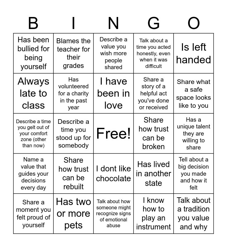 This bingo card has a free space and 26 words: I dont like chocolate, I know how to play an instrument, I have been in love, Has two or more pets, Is left handed, Has been bullied for being yourself, Always late to class, Blames the teacher for their grades, Has a unique talent they are willing to share, Has lived in another state, Share a story of a helpful act you've done or received, Describe a time you gelt out of your comfort zone (other than now), Tell about a big decision you made and how it felt, Share a moment you felt proud of yourself, Describe a time you stood up for somebody, What is your dream job, Talk about a time you acted honestly, even when it was difficult, Name a value that guides your decisions every day, Describe a value you wish more people shared, Talk about a tradition you value and why, Share what a safe space looks like to you, Talk about how someone might recognize signs of emotional abuse, Share how trust can be broken, Share how trust can be rebuilt, Has volunteered for a charity in the past year and Wears socks to bed.