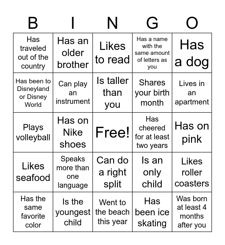 This bingo card has a free space and 24 words: Speaks more than one language, Is the youngest child, Is taller than you, Has the same favorite color, Has a dog, Has traveled out of the country, Has been to Disneyland or Disney World, Has an older brother, Has cheered for at least two years, Can do a right split, Shares your birth month, Plays volleyball, Is an only child, Likes roller coasters, Can play an instrument, Has been ice skating, Has on pink, Likes to read, Lives in an apartment, Has on Nike shoes, Was born at least 4 months after you, Likes seafood, Has a name with the same amount of letters as you and Went to the beach this year.