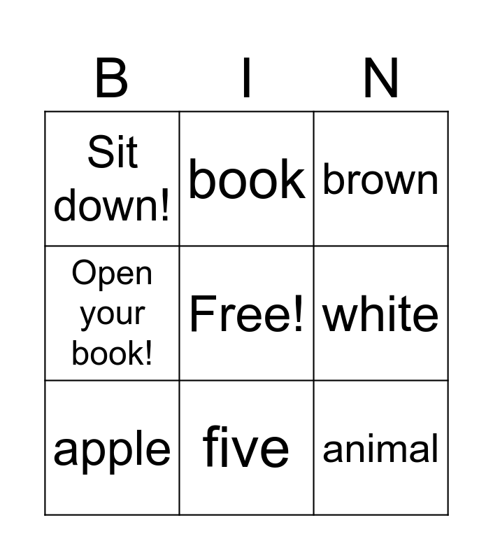 This bingo card has a free space and 8 words: white, brown, book, apple, Sit down!, animal, Open your book! and five.