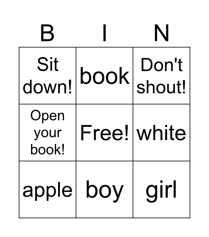 This bingo card has a free space and 8 words: white, Don't shout!, book, apple, Sit down!, girl, Open your book! and boy.