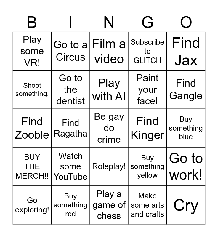 This bingo card has a free space and 24 words: Watch some YouTube, Buy something red, Play with AI, Go exploring!, Find Jax, Play some VR!, Shoot something., Go to a Circus, Find Kinger, Roleplay!, Paint your face!, Find Zooble, Buy something yellow, Go to work!, Go to the dentist, Make some arts and crafts, Buy something blue, Film a video, Find Gangle, Find Ragatha, Cry, BUY THE MERCH!!, Subscribe to GLITCH and Play a game of chess.