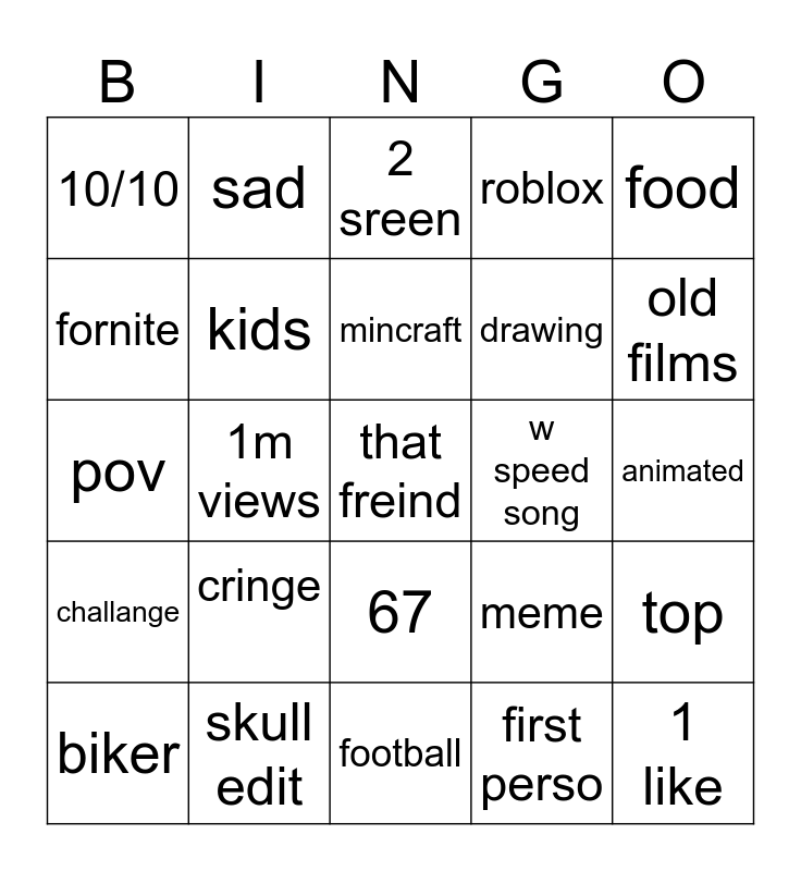 This bingo card has a free space and 24 words: cringe, skull edit, mincraft, biker, food, 10/10, fornite, sad, w speed song, 67, drawing, pov, meme, top, kids, first perso, animated, 2 sreen, old films, 1m views, 1 like, challange, roblox and football.