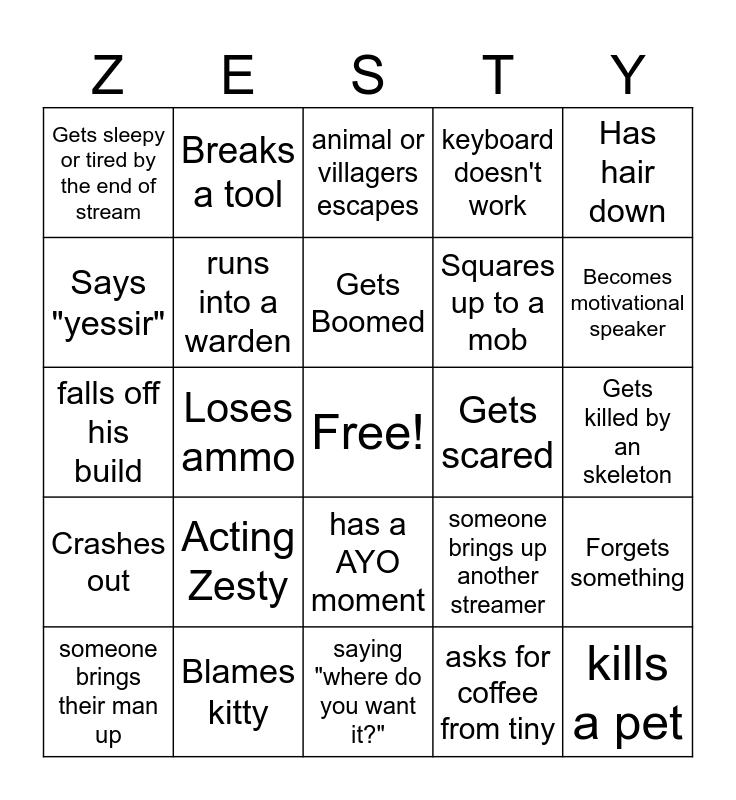 This bingo card has a free space and 24 words: Acting Zesty, Blames kitty, Gets Boomed, someone brings their man up, Has hair down, Gets sleepy or tired by the end of stream, Says "yessir", Breaks a tool, Gets scared, has a AYO moment, Squares up to a mob, falls off his build, someone brings up another streamer, Forgets something, runs into a warden, asks for coffee from tiny, Gets killed by an skeleton, animal or villagers escapes, Becomes motivational speaker, Loses ammo, kills a pet, Crashes out, keyboard doesn't work and saying "where do you want it?".