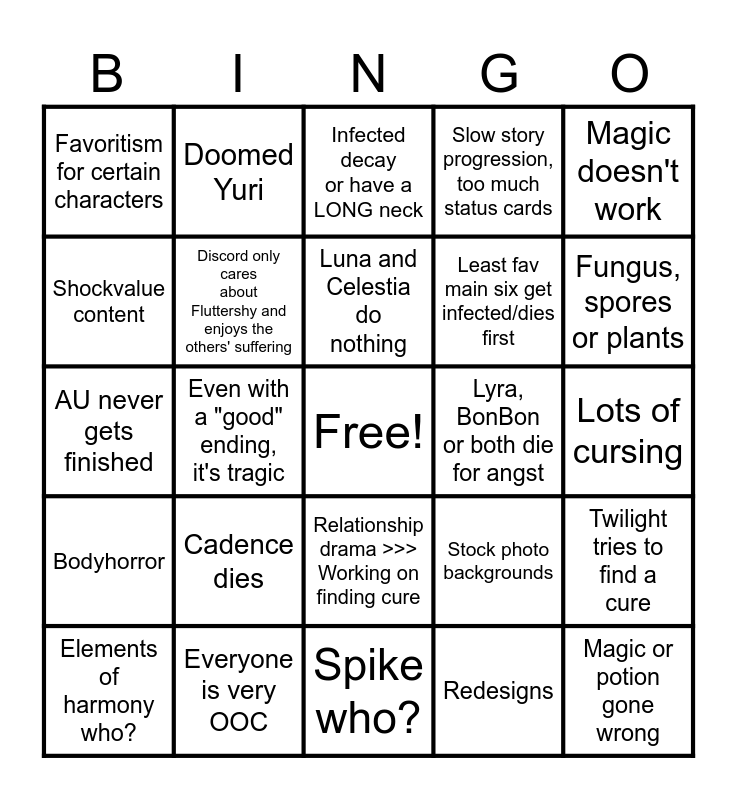 This bingo card has a free space and 24 words: Cadence dies, Everyone is very OOC, Luna and Celestia do nothing, Elements of harmony who?, Magic doesn't work, Favoritism for certain characters, Shockvalue content, Doomed Yuri, Lyra, BonBon or both die for angst, Relationship drama >>> Working on finding cure, Least fav main six get infected/dies first, AU never gets finished, Stock photo backgrounds, Twilight tries to find a cure, Discord only cares about Fluttershy and enjoys the others' suffering, Redesigns, Lots of cursing, Infected decay or have a LONG neck, Fungus, spores or plants, Even with a "good" ending, it's tragic, Magic or potion gone wrong, Bodyhorror, Slow story progression, too much status cards and Spike who?.