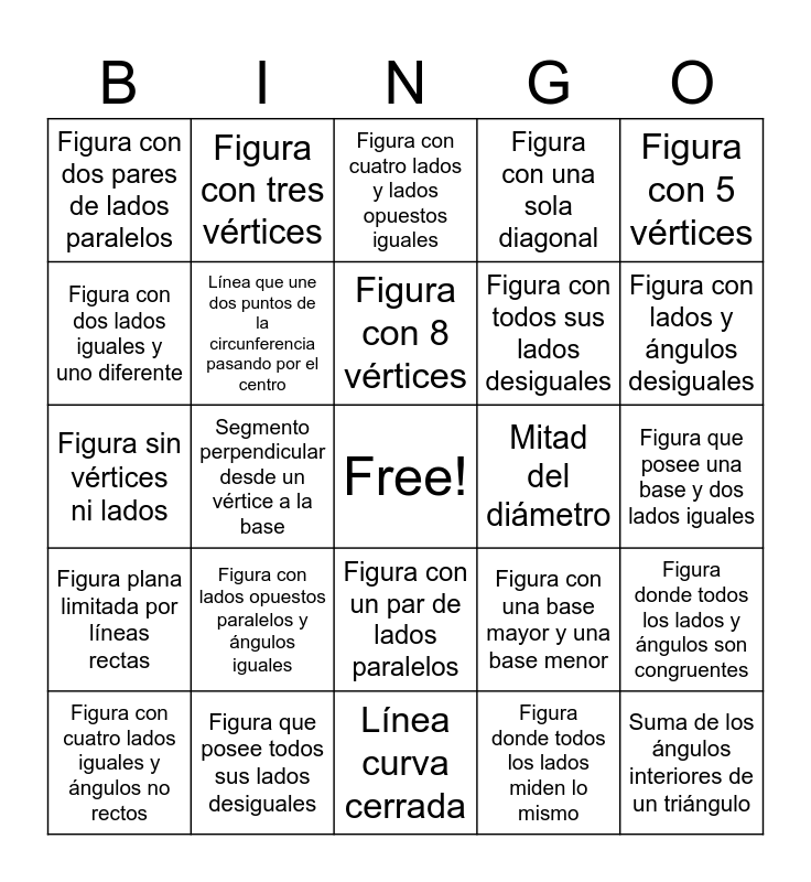 This bingo card has a free space and 84 words: Figura con tres lados, Figura con cuatro lados iguales y ángulos rectos, Figura con cuatro lados y lados opuestos iguales, Figura con todos los puntos a igual distancia del centro, Figura con cinco lados, Figura con seis lados, Figura con ocho lados, Parte interior limitada por una curva cerrada, Suma de los lados de una figura, Punto donde se cruzan dos lados, Línea que une dos vértices no consecutivos, Línea que une el centro con un punto de la circunferencia, Línea que une dos puntos de la circunferencia pasando por el centro, Mitad del diámetro, Figura con un par de lados paralelos, Figura con dos pares de lados paralelos, Figura con cuatro lados iguales y ángulos no rectos, Figura con dos lados iguales y uno diferente, Figura con un ángulo recto, Figura con tres lados iguales, Figura con un solo par de lados iguales, Figura con todos sus lados desiguales, Suma de los ángulos interiores de un triángulo, Suma de los ángulos interiores de un cuadrilátero, Segmento perpendicular desde un vértice a la base, Figura con tres lados y un ángulo recto, Línea que divide un ángulo en dos partes iguales, Figura formada por puntos equidistantes de un punto fijo, Distancia alrededor de una figura, Cantidad de espacio dentro de una figura, Figura con lados opuestos paralelos y ángulos iguales, Figura con cuatro lados iguales y diagonales perpendiculares, Parte del plano limitada por arcos y cuerdas, Figura sin vértices ni lados, Parte plana de un cuerpo geométrico, Figura de tres lados iguales y tres ángulos iguales, Línea curva cerrada, Figura con todos los lados y ángulos iguales, Figura con lados y ángulos desiguales, Figura plana limitada por líneas rectas, Punto donde se unen los lados de un polígono, Figura con tres lados distintos, Figura con cuatro vértices, Figura con dos diagonales, Figura con cuatro ángulos rectos, Figura con lados paralelos e iguales, Figura con tres vértices, Figura que representa un polígono cerrado, Figura que tiene cuatro lados iguales, Figura donde todos los lados son iguales, Figura que tiene 6 vértices, Figura con una base mayor y una base menor, Figura con una sola diagonal, Figura con lados iguales y opuestos paralelos, Figura con tres lados y tres ángulos, Figura que tiene ángulos de 90 grados, Figura que posee todos sus lados desiguales, Figura con 8 vértices, Figura que no tiene ángulos, Figura que posee una base y dos lados iguales, Figura con vértices, lados y ángulos, Figura donde la suma de los ángulos es 180 grados, Figura donde la suma de los ángulos es 360 grados, Línea que toca una circunferencia en un solo punto, Figura compuesta por líneas rectas, Figura con lados perpendiculares, Figura con lados paralelos, Figura con lados desiguales, Figura con 5 vértices, Figura con 6 lados, Figura donde todos los lados y ángulos son congruentes, Figura que no tiene lados curvos, Figura que no tiene vértices, Figura con base y altura, Figura con un par de lados paralelos, Figura donde todos los lados miden lo mismo, Figura plana con lados rectos, Figura cerrada y plana, Figura donde los lados opuestos son iguales, Figura con lados iguales y diagonales perpendiculares, Figura que representa un triángulo rectángulo, Figura plana limitada por líneas curvas, Figura con lados iguales pero ángulos diferentes and Figura con todos los lados iguales y ángulos iguales.