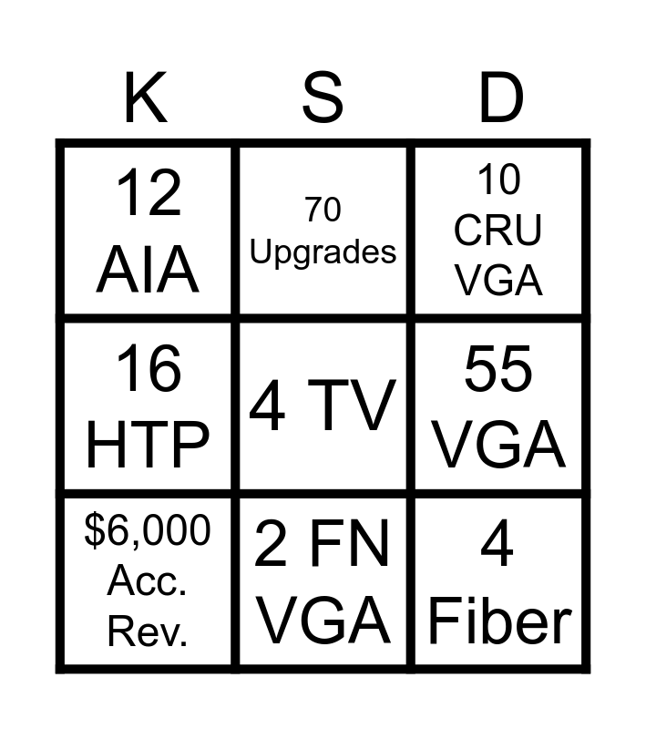 This bingo card has a free space and 8 words: 55 VGA, 10 CRU VGA, 70 Upgrades, $6,000 Acc. Rev., 12 AIA, 4 Fiber, 16 HTP and 2 FN VGA.