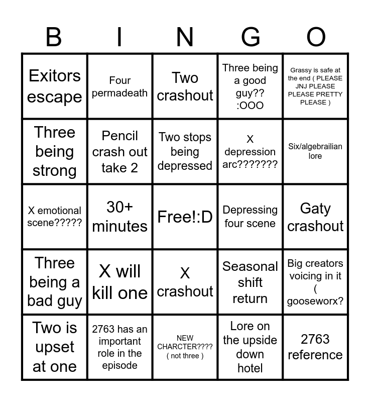 This bingo card has a free space and 24 words: X will kill one, 2763 has an important role in the episode, Two stops being depressed, Two is upset at one, Grassy is safe at the end ( PLEASE JNJ PLEASE PLEASE PRETTY PLEASE ), Exitors escape, Three being strong, Four permadeath, Depressing four scene, X crashout, X depression arc???????, X emotional scene?????, Seasonal shift return, Big creators voicing in it ( gooseworx?, Pencil crash out take 2, Lore on the upside down hotel, Gaty crashout, Two crashout, Six/algebrailian lore, 30+ minutes, 2763 reference, Three being a bad guy, Three being a good guy?? :OOO and NEW CHARCTER???? ( not three ).