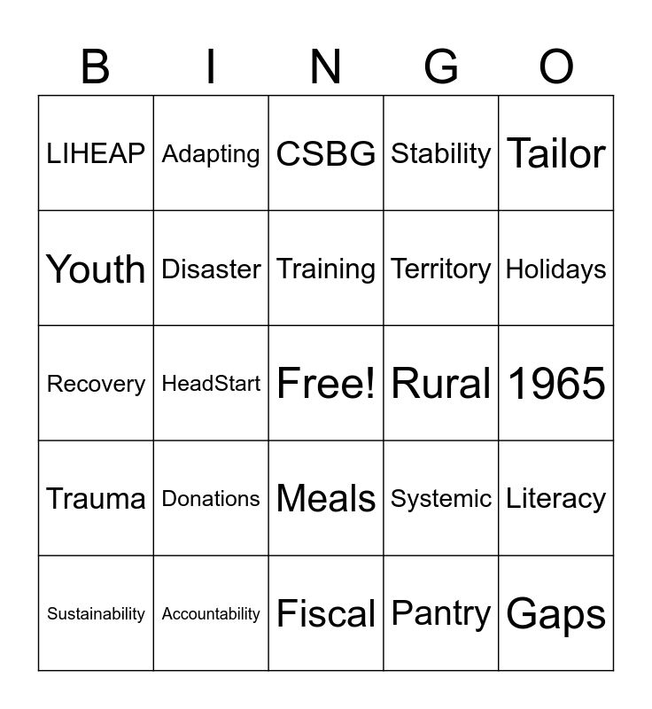 This bingo card has a free space and 100 words: Opportunity, Poverty, 1965, Empower, Local, Participation, Grassroots, OEO, Administration, Grant, Nonprofit, Tripartite, Officials, Accountability, 1981, Thousand, Territory, Counties, Assessment, Standards, Self-sufficiency, Holistic, Charity, Themselves, Hub, Rural, Tailor, Systemic, Partnerships, Responders, HeadStart, LIHEAP, Weatherization, Housing, Pantry, Training, Literacy, Transportation, Childcare, Shelter, Transitional, Schools, Recovery, Taxes, Holidays, CSBG, Funding, Leverage, Reports, Fiscal, Nonpartisan, Audits, Outcomes, ROMA, Impact, Fifteen, Families, Children, Savings, Stability, Homelessness, Employment, Independence, Volunteerism, Network, UnitedWay, MOUs, Commissioners, HomelessnessCoC, Hospitals, Volunteers, Donations, Fairs, Collaboration, Diversity, Seniors, Veterans, Youth, Inclusion, Working, Transportation, Gaps, Refugees, Meals, Utilities, Adapting, Data, Enterprise, TwoGen, Trauma, Digital, Blueprint, Credit, Sustainability, Disaster, Helping, Dignity, Equity, Solutions and Hope.